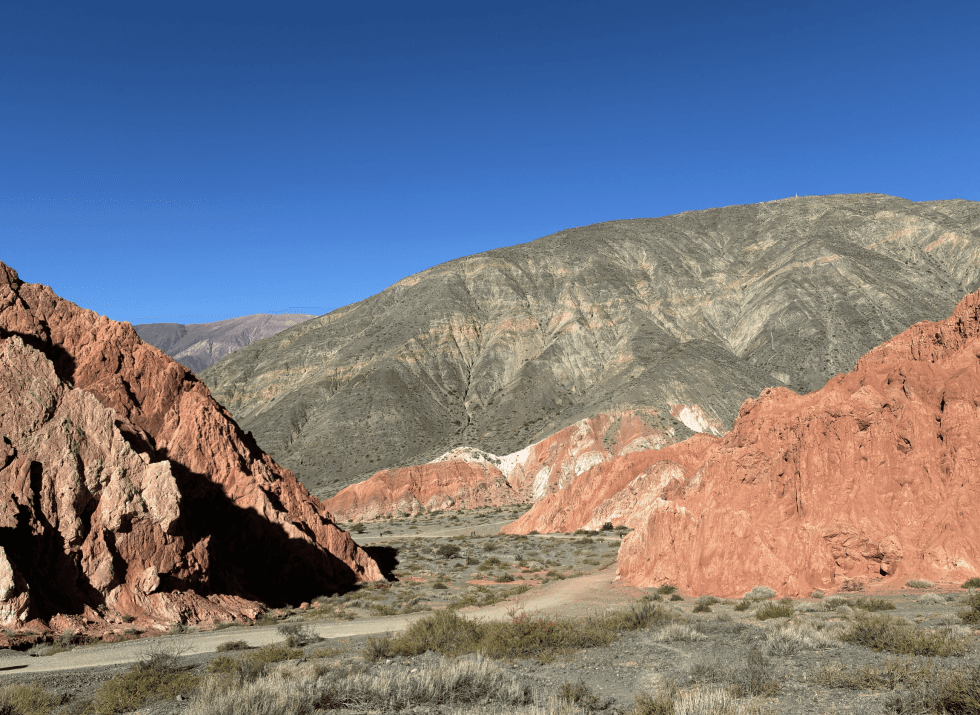 Al día siguiente hice el recorrido completo de 3 kilómetros alrededor del Cerro de los Siete Colores, un sendero que te rodea el cerro por completo y te muestra distintos ángulos y tonalidades a cada paso: rojos, violetas, verdes, ocres. No hace falta filtro, todo parece pintado a mano. Es geología pura, millones de años comprimidos en una postal viva. Purmamarca me marcó, sin duda fue uno de los puntos más potentes de todo el viaje.